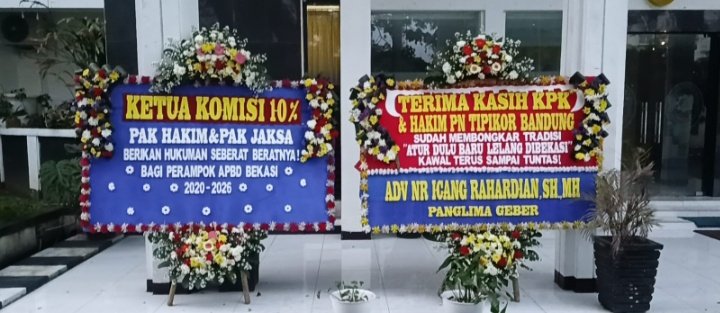”Terima kasih KPK & Hakim PN Tipikor Bandung sudah membongkar tradisi ‘Atur Dulu Baru Lelang di Bekasi’. Kawal terus sampai tuntas!” demikian bunyi pesan yang tertulis pada karangan bunga tersebut. Rabu 8/4/2026