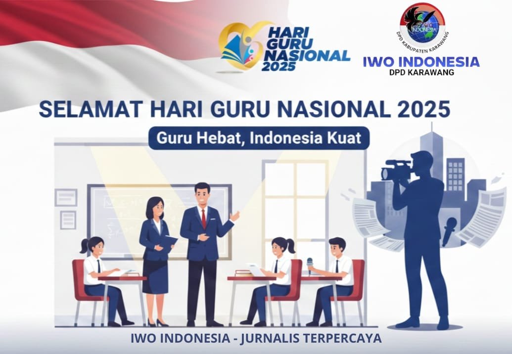 KARAWANG | JENDELAKITA.CLICK – Ketua Ikatan Wartawan Online Indonesia (IWO Indonesia) DPD Karawang, Syuhada Wisastra, menyampaikan ucapan selamat memperingati Hari Guru Nasional 2025 yang diperingati setiap tanggal 25 November. Tahun ini, pemerintah melalui Kemendikdasmen mengusung tema “Guru Hebat, Indonesia Kuat”, sebagai komitmen memperkuat budaya keteladanan, memperluas praktik baik dalam pendidikan, serta membangun ekosistem pembelajaran yang inklusif dan adaptif.