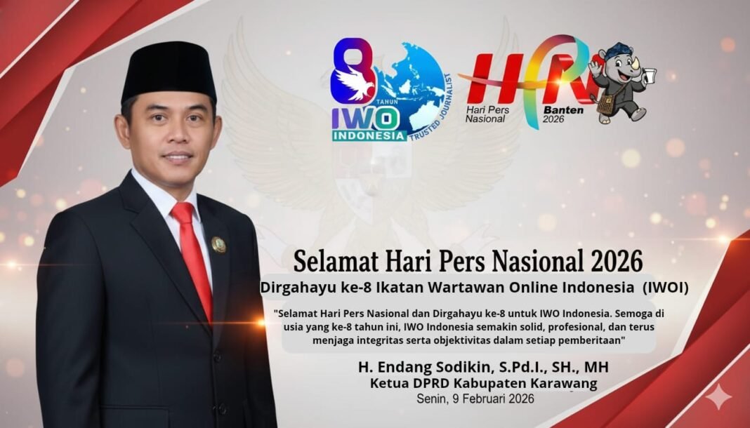 KARAWANG | JENDELAKITA.CLICK – Ketua DPRD Kabupaten Karawang menyampaikan ucapan selamat Hari Pers Nasional (HPN) serta Dirgahayu ke-8 kepada Ikatan Wartawan Online Indonesia (IWO Indonesia) pada Senin, 9 Februari 2026.
