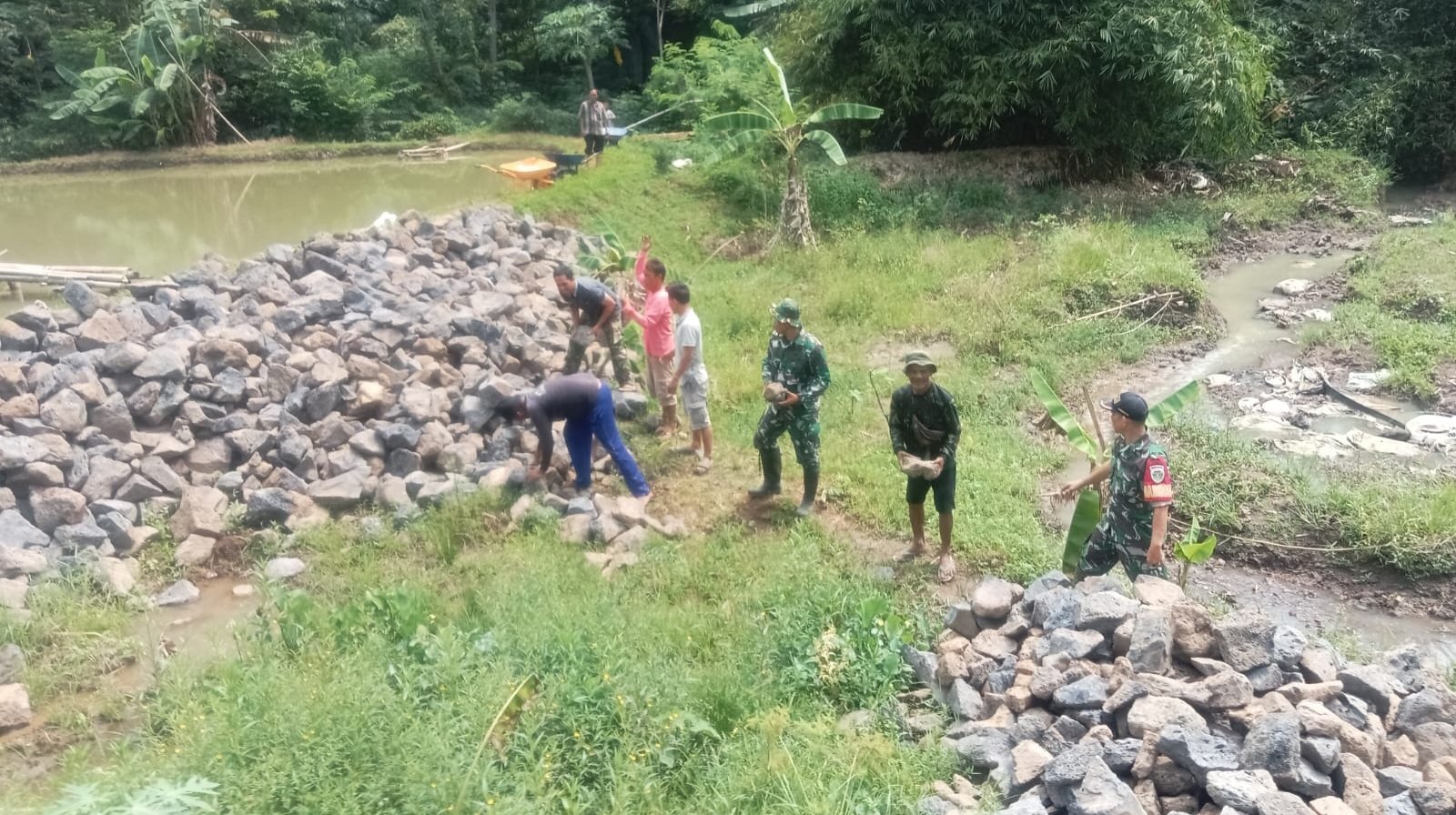 SUBANG | JENDELAKITA.click | Dalam semangat kemanunggalan TNI dengan rakyat, anggota Koramil 0510/Binong Kodim 0605/Subang melaksanakan kegiatan karya bakti pembangunan tanggul di aliran Sungai Cigadung, RT 09 RW 02, Desa Bojonegara, Kecamatan Tambakdahan, Selasa (05/08/2025).